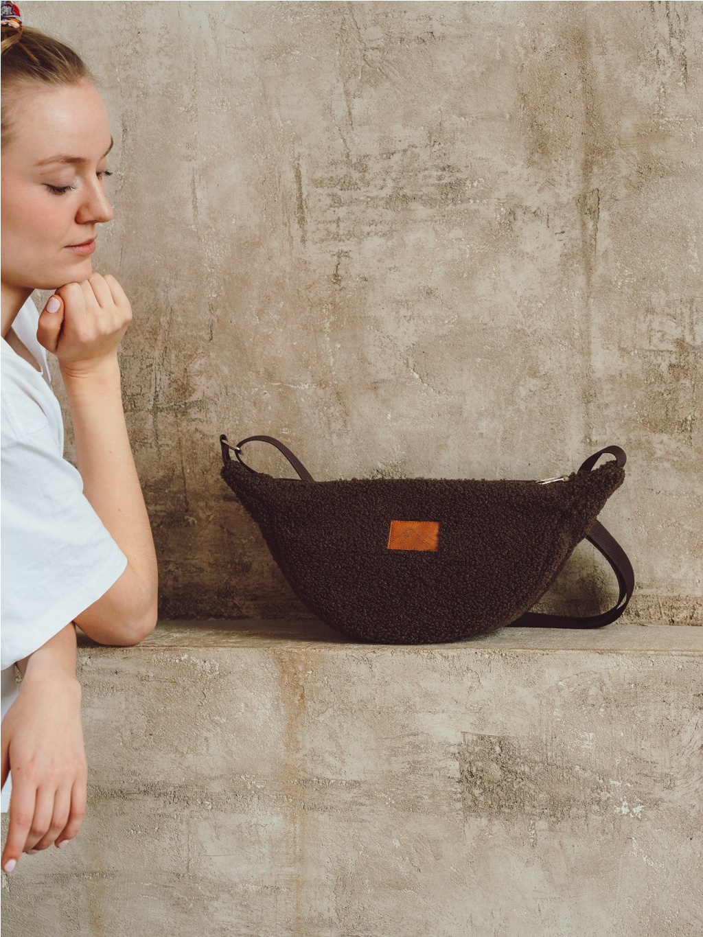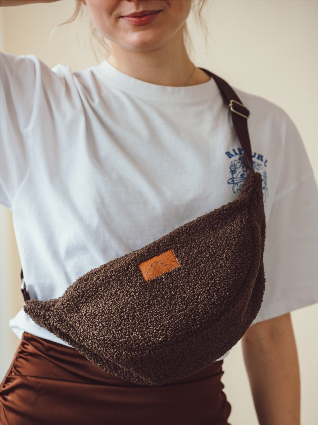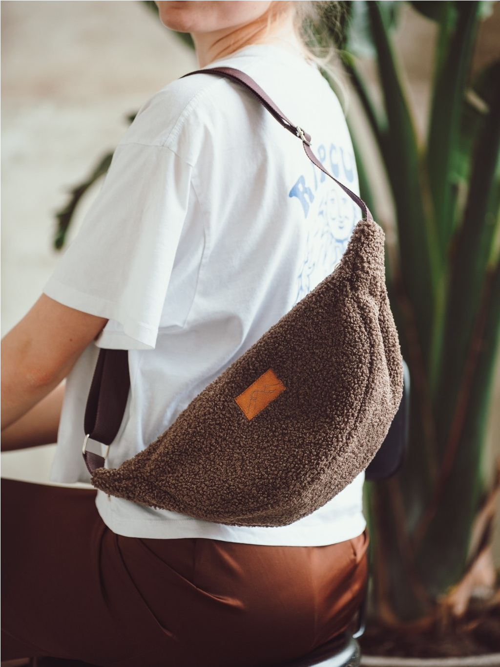 Lehká, měkká a překvapivě prostorná. Stylová půlměsícová kabelka z moderního teddy materiálu, kterou můžete nosit crossbody i přes rameno.